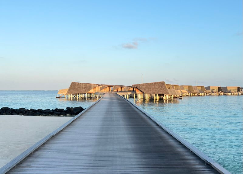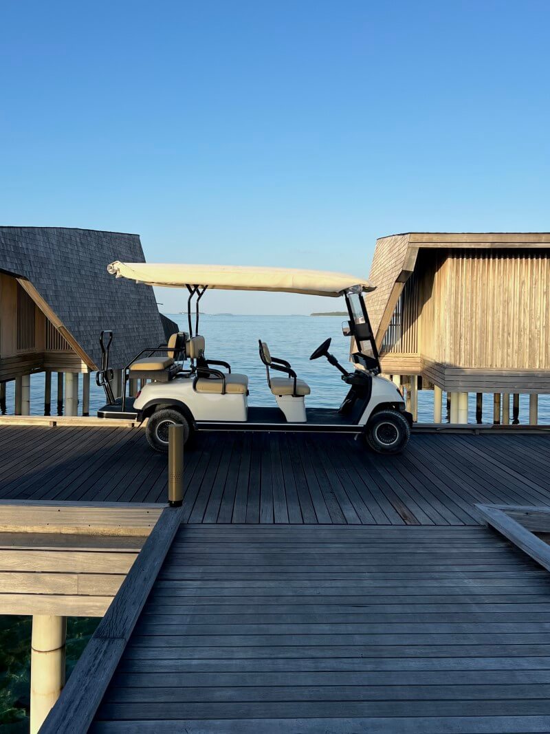 The ride itself is one of the best parts. The sea is still half asleep, the waves barely moving. The sky is soft blue, with a sliver of sunlight beginning to appear. There is very little sound, aside from nature and the quiet creak of wooden planks as the buggy moves along. If you’re paying attention, there are small things to notice. One morning, an enormous stingray lounging just below the villa, completely unbothered. Another day, a small family of devil rays moving along together, apparently on their morning exercise as well. Occasionally, a bird dips into the water, checking on breakfast. As you move along the island, it becomes clear that everyone else is committed to their holiday plans of sleeping in.